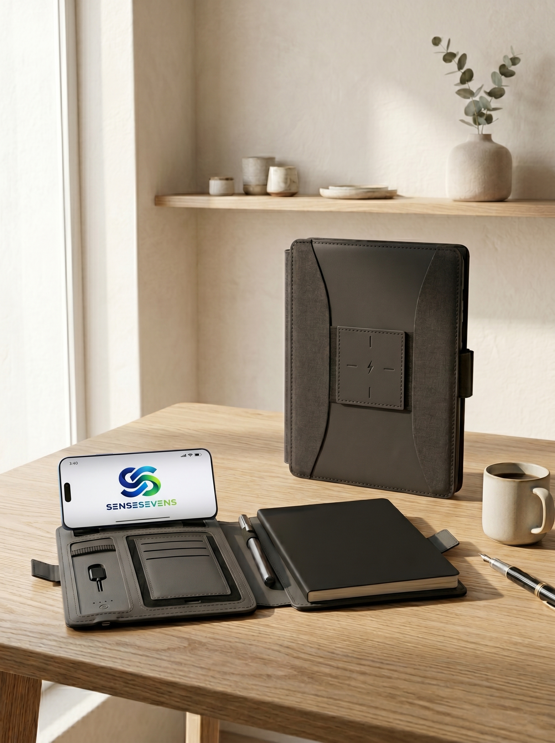 Powerbank Organizer 7000 mAh Işıklı Logo Baskısı A4 Not Defteri Telefon Tutucu Kalem Takma Yeri Kartlık